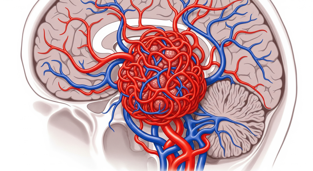 Une MAV est un enchevêtrement d'artères et de veines anormales dans le cerveau qui perturbe la circulation sanguine normale et augmente le risque de saignement.